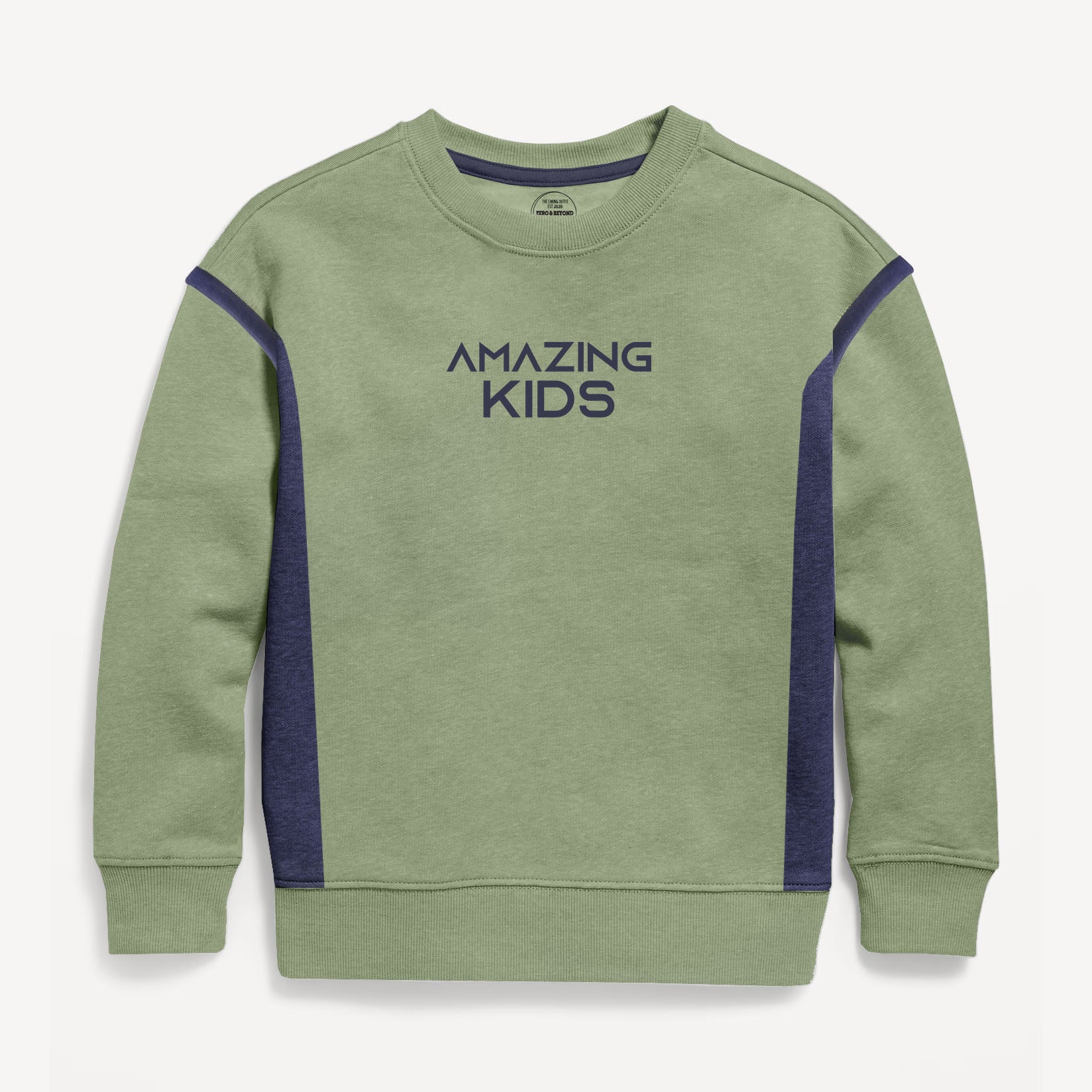 Introducing our Olive Sweatshirt for boys, featuring the bold printed text "AMAZING KIDS" and stylish navy side panels. This high-end fashion piece is crafted from soft, premium fabric, ensuring all-day comfort and warmth for winter adventures.