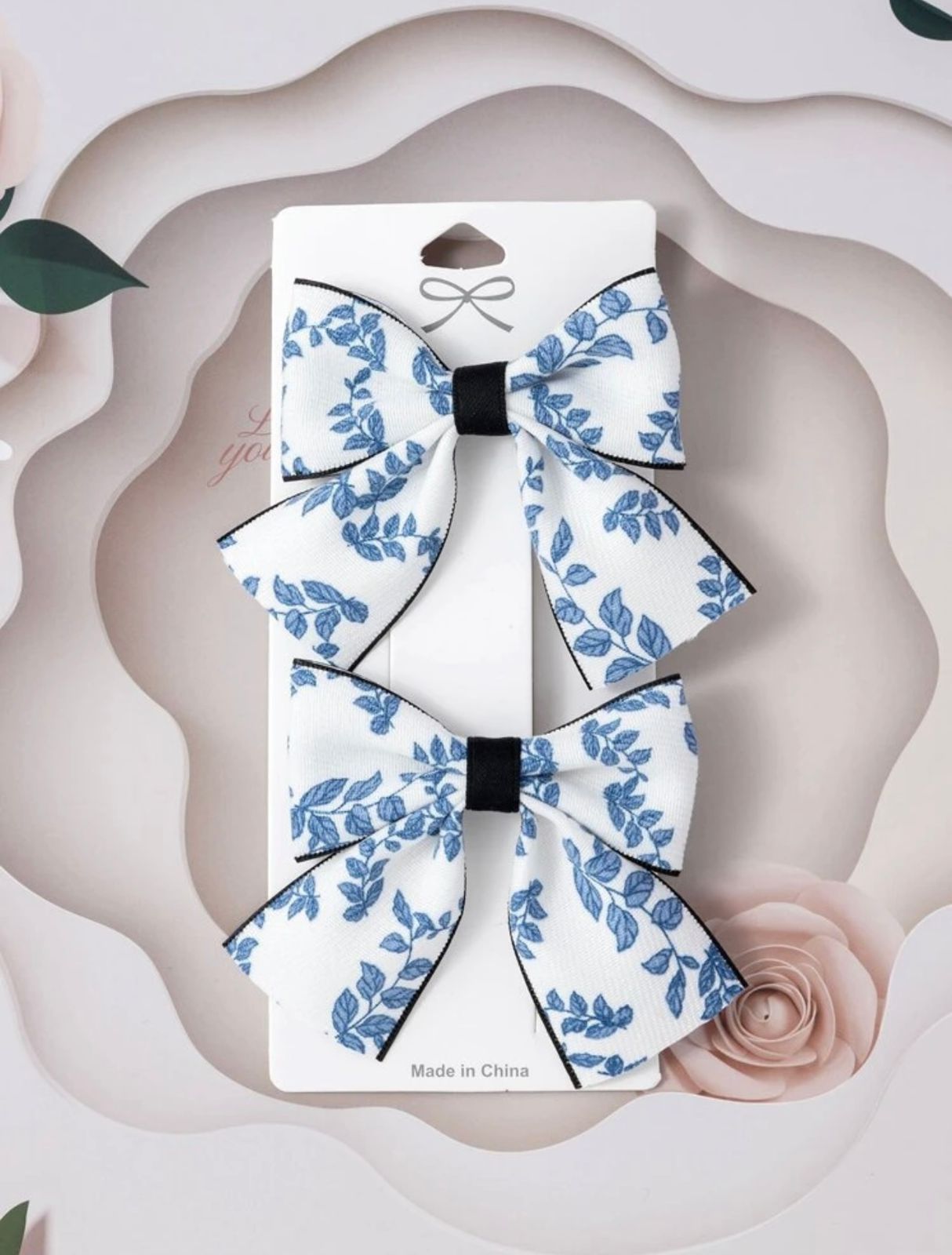Delicate imported blue floral print hair clip bow pair, adding a pop of color and charm to any look. Crafted for comfort and secure styling.