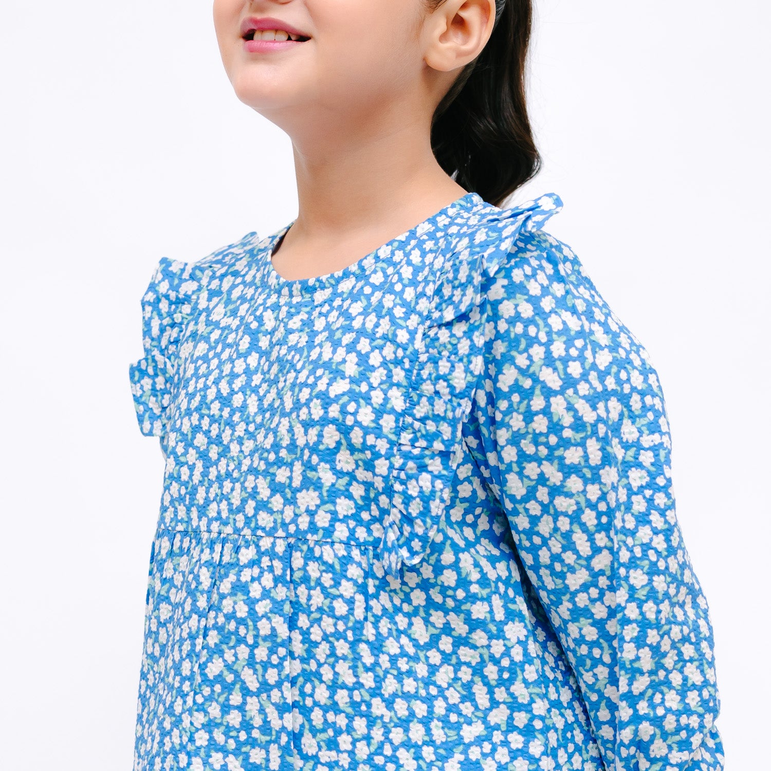 Introducing our lovely blue top with a cute floral print, perfect for rocking the summer style game. The gathered sleeves and ruffled shoulders add a charming detail. The blue color gives it a cool, refreshing look, making it a go-to choice for birthdays, picnics, and casual day-outs in this hot summer weather.