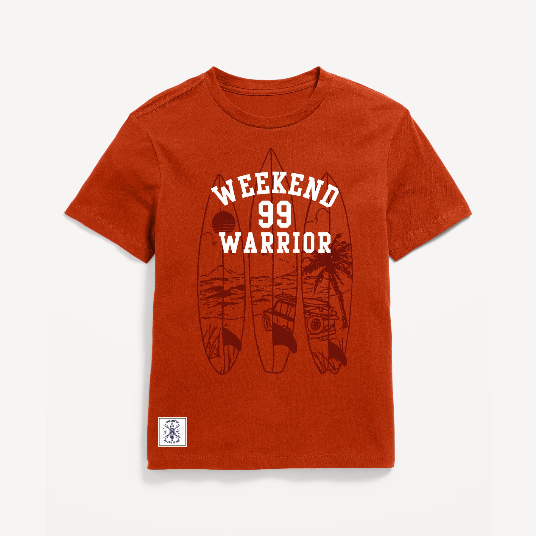 A classic vermilion t-shirt featuring a bold Weekend Warrior graphic on the front. Made from soft, breathable fabric, it offers comfort and durability for everyday wear. With its playful yet strong design, it’s the perfect pick for school, play, or relaxed weekend outings.