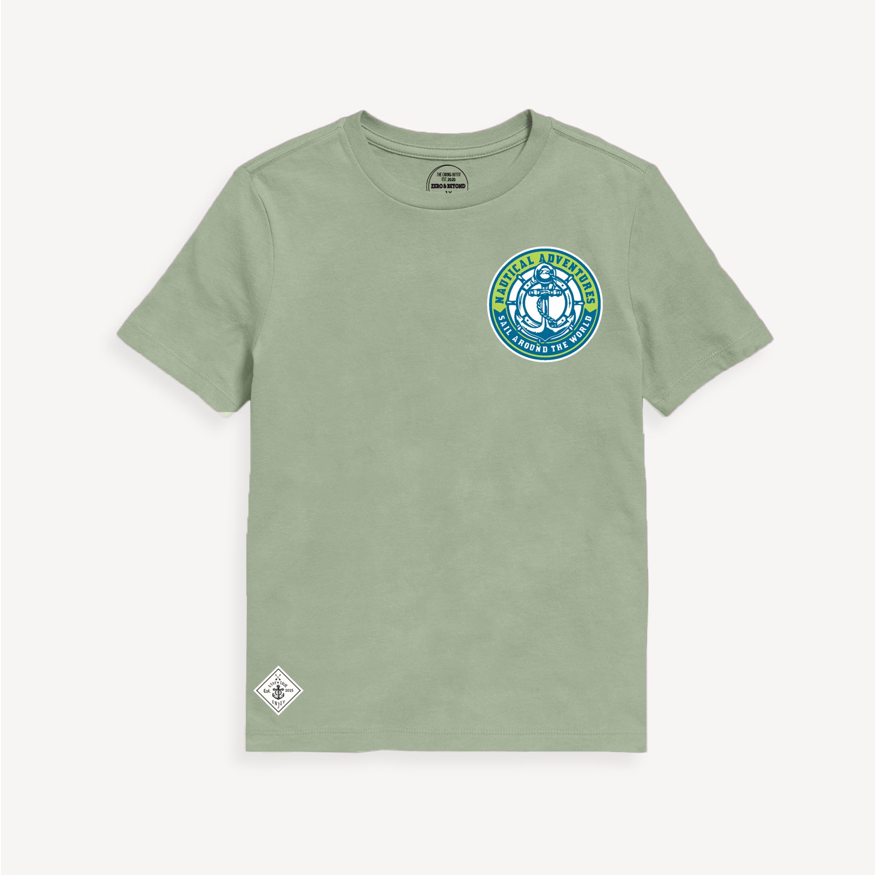 An olive green t-shirt featuring a bold blue round "Nautical Adventure" logo. Made from comfortable, breathable fabric, it’s perfect for casual everyday wear. The simple yet stylish design makes it a versatile addition to any kid’s wardrobe.