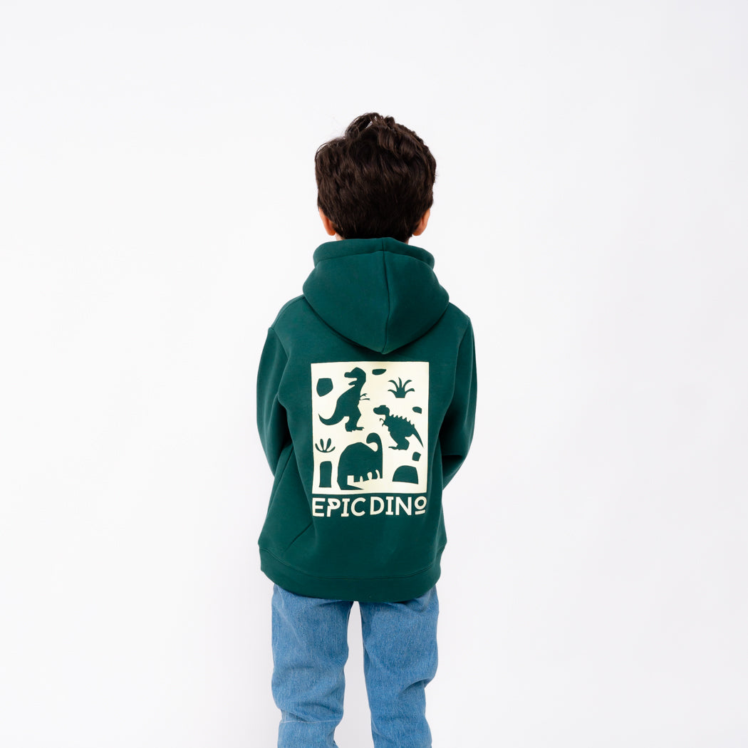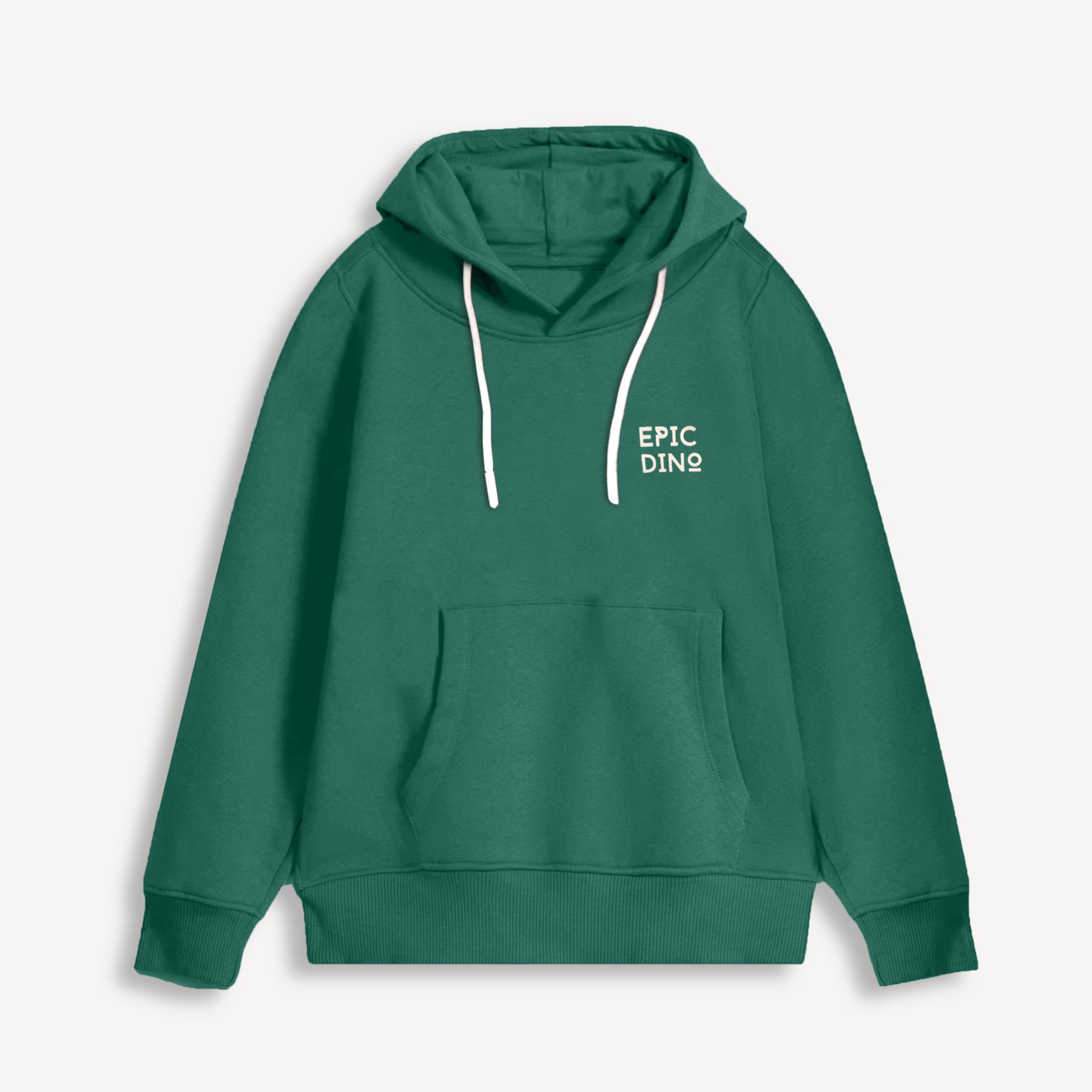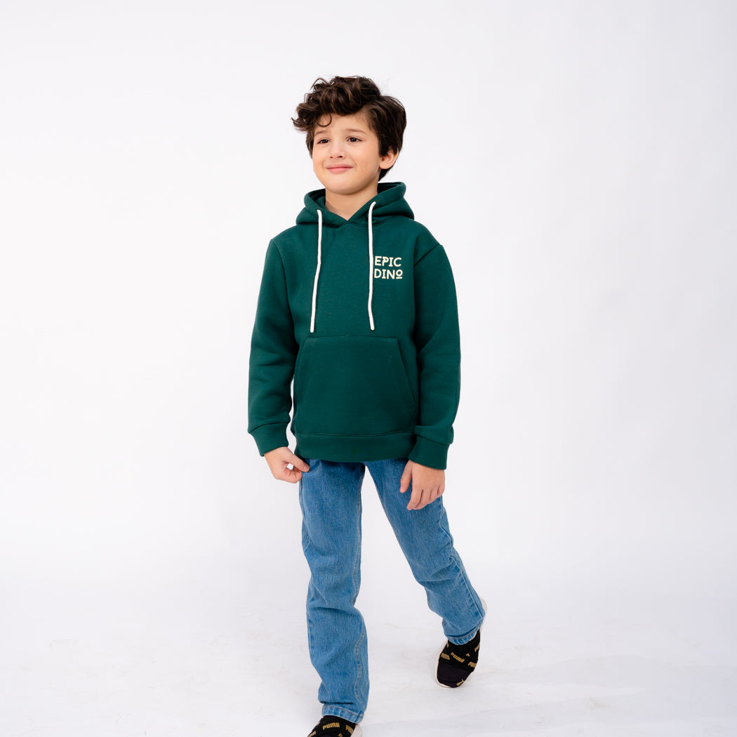 This green hoodie for boys is perfect for winter, combining warmth and style with a fun twist. Crafted from soft fabric, it ensures comfort and coziness throughout the colder months. Featuring bold 'EPIC DINO' text on the front, it adds a cool touch of adventure, while the back showcases a vibrant dinosaur design for the ultimate Dino fan experience. Complete with a hood, drawstrings, and a front pocket, this hoodie is both practical and stylish, perfect for keeping little ones snug on chilly days.