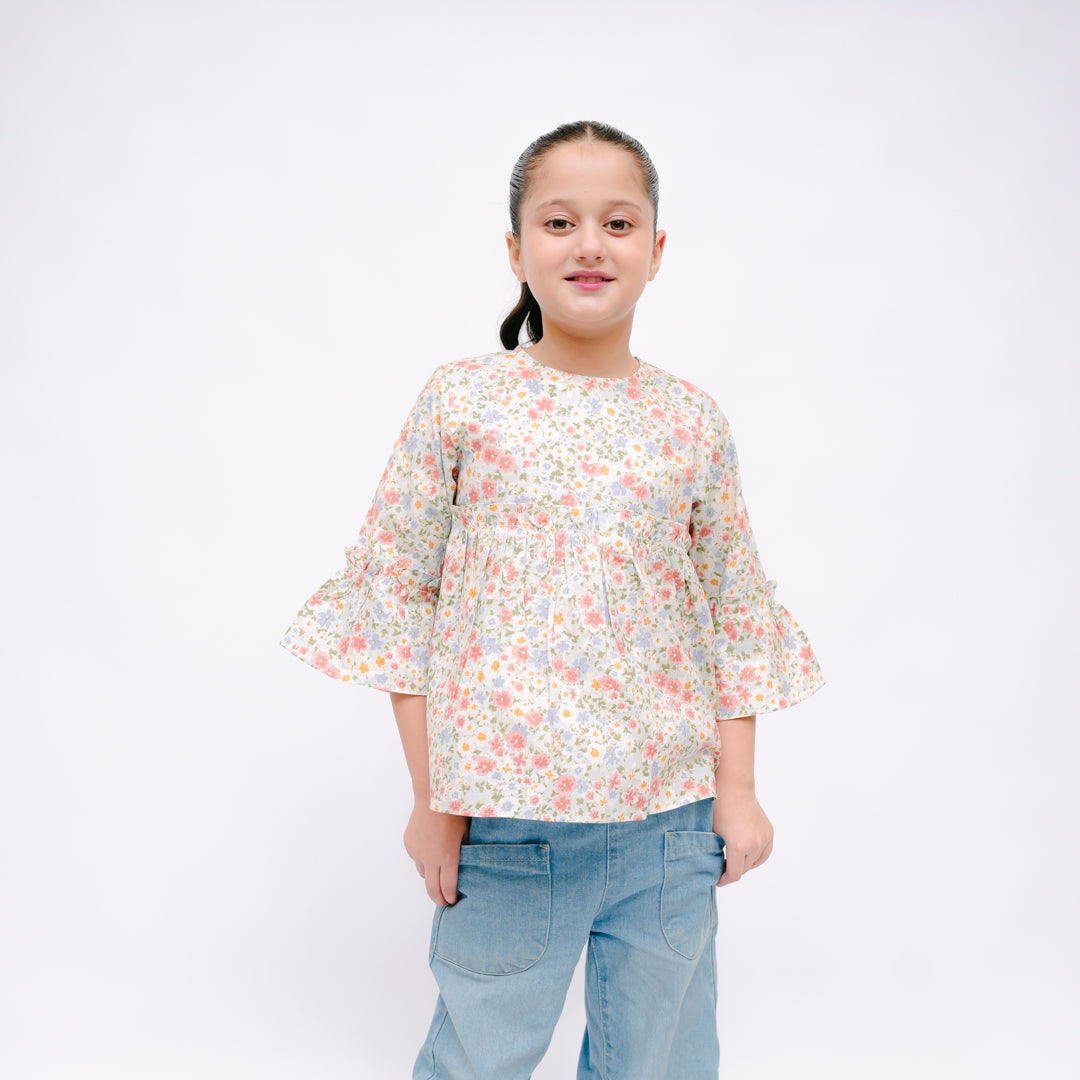 The top features a delicate floral print in soft pastel colors. It has a charming and light-hearted pattern and a round neckline. The long bell sleeves have ruffled cuffs. The pleating below the bust creates a loose and comfortable fit. This design is ideal for maintaining a cool and airy feel during the summer.