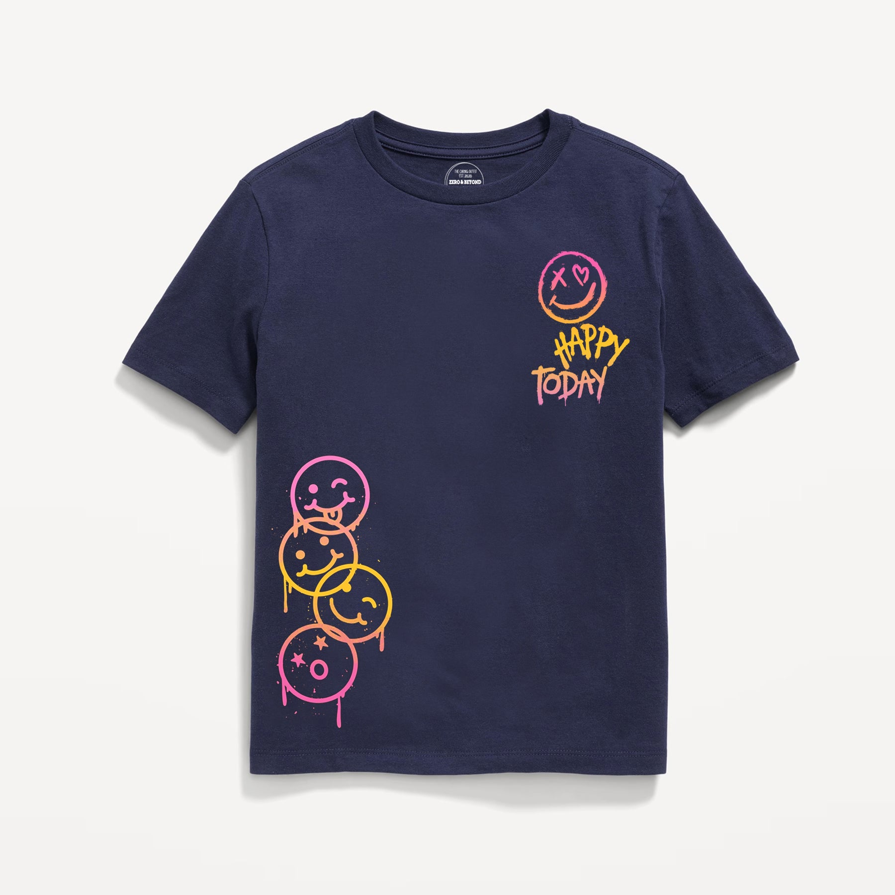 Let the good vibes roll with this fun and playful navy t-shirt, featuring a cheerful smiley graphic! Crafted from soft, breathable fabric perfect for summer adventures, playdates, and everyday fun.