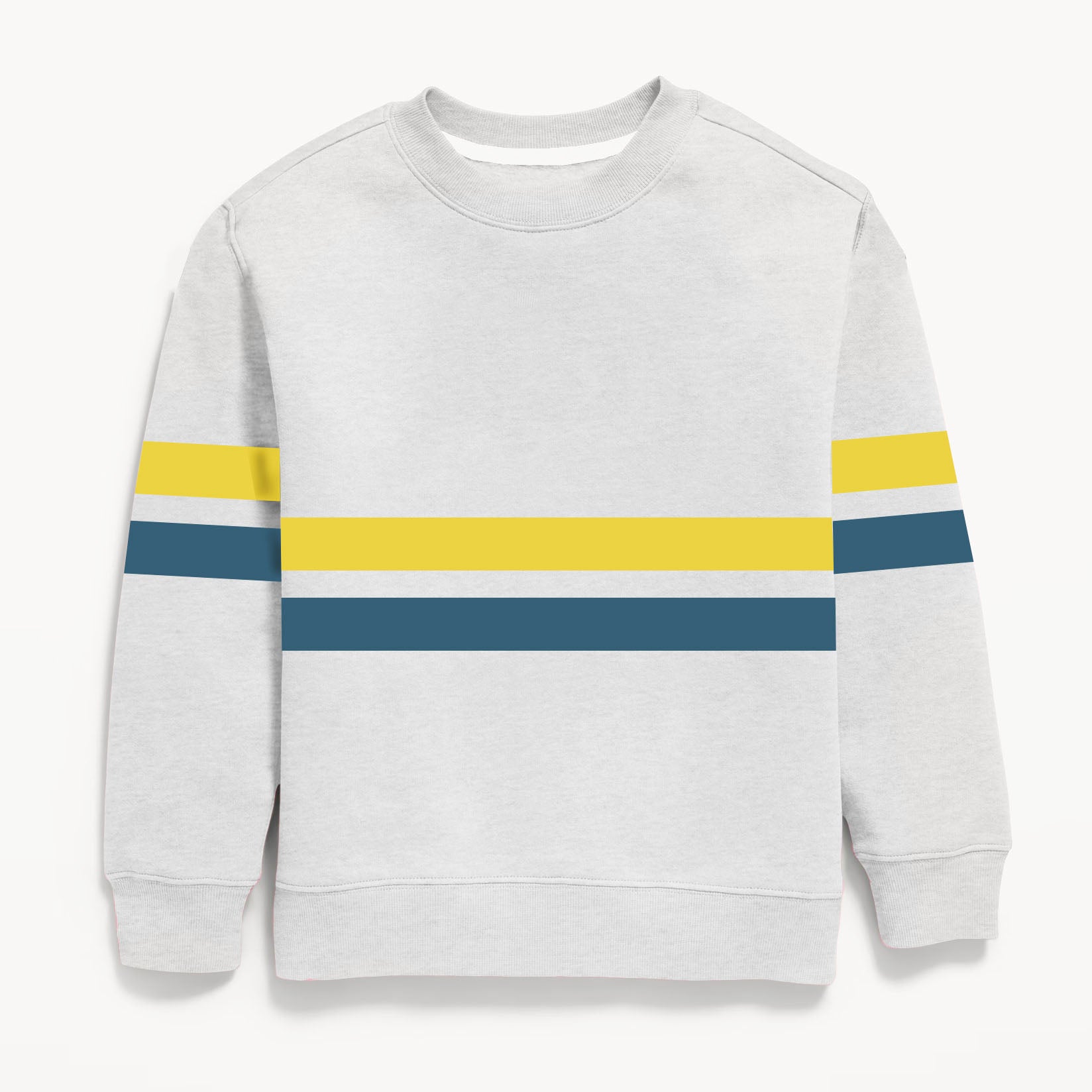 A gray sweatshirt with horizontal stripes in yellow and teal colors, designed with bold yellow and teal accents, brings a vibrant touch to classic winter wear for kids. Made from soft fabric, it offers both warmth and comfort while ensuring a stylish look. Perfect for chilly days, this cozy piece combines practicality with playful design for everyday wear.