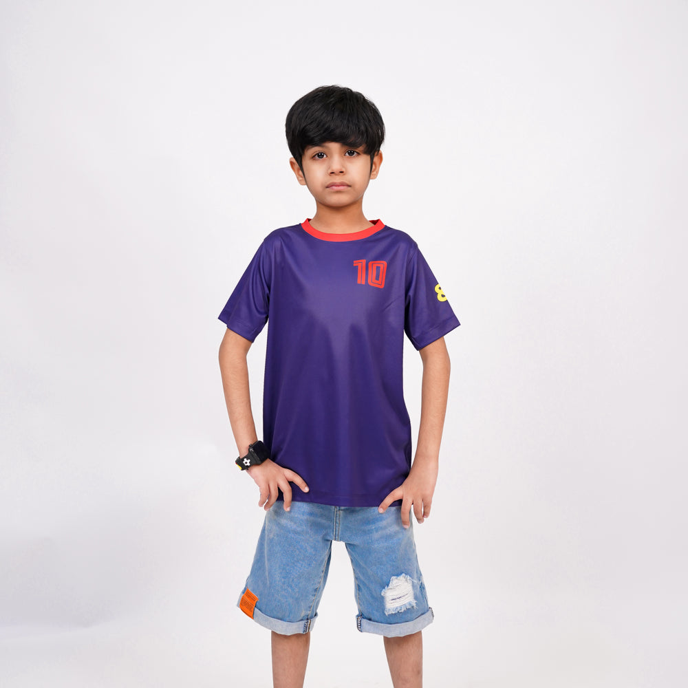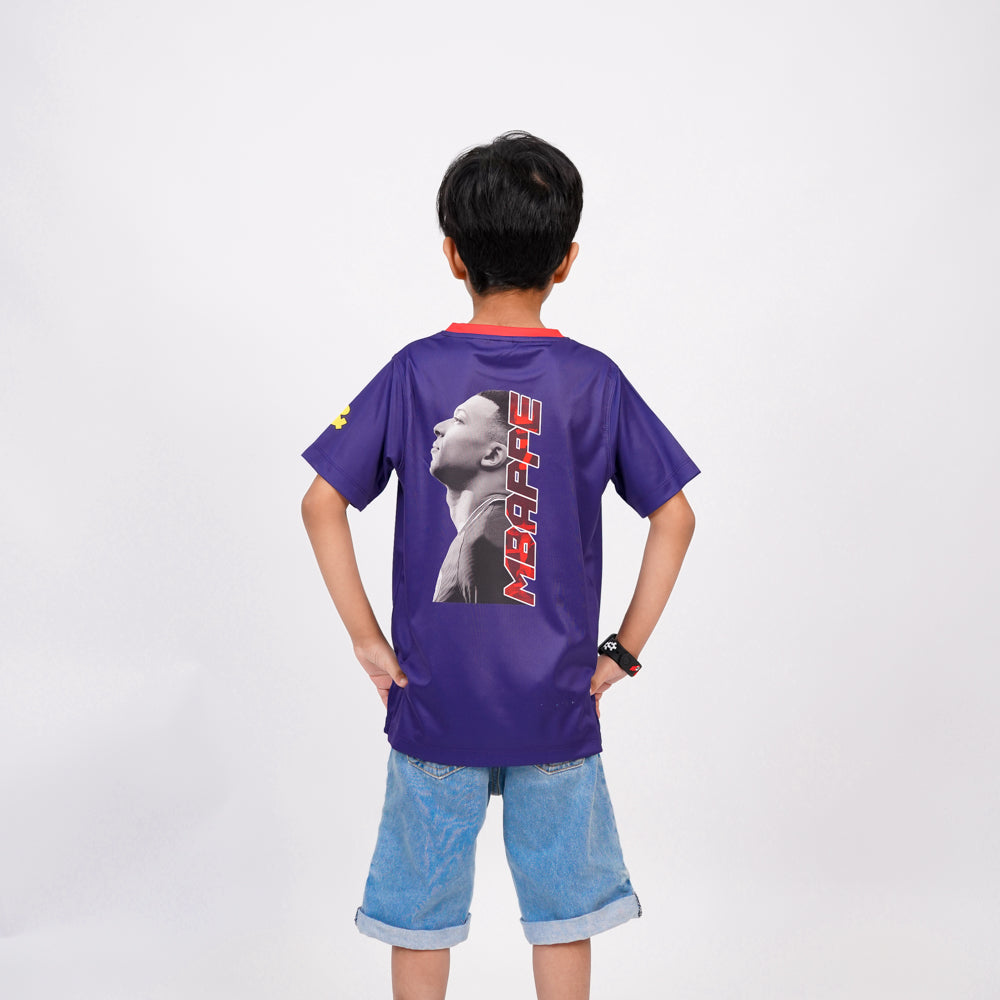 Let your child channel the energy and skill of Kylian Mbappé with this premium navy blue T-shirt. Featuring a bold red collar and number 10 graphic, it’s designed for future football stars. Made from 100% polyester, the fabric is soft, lightweight, and breathable for all-day comfort. Moisture-wicking properties keep them cool and dry through every sprint, kick, and goal.