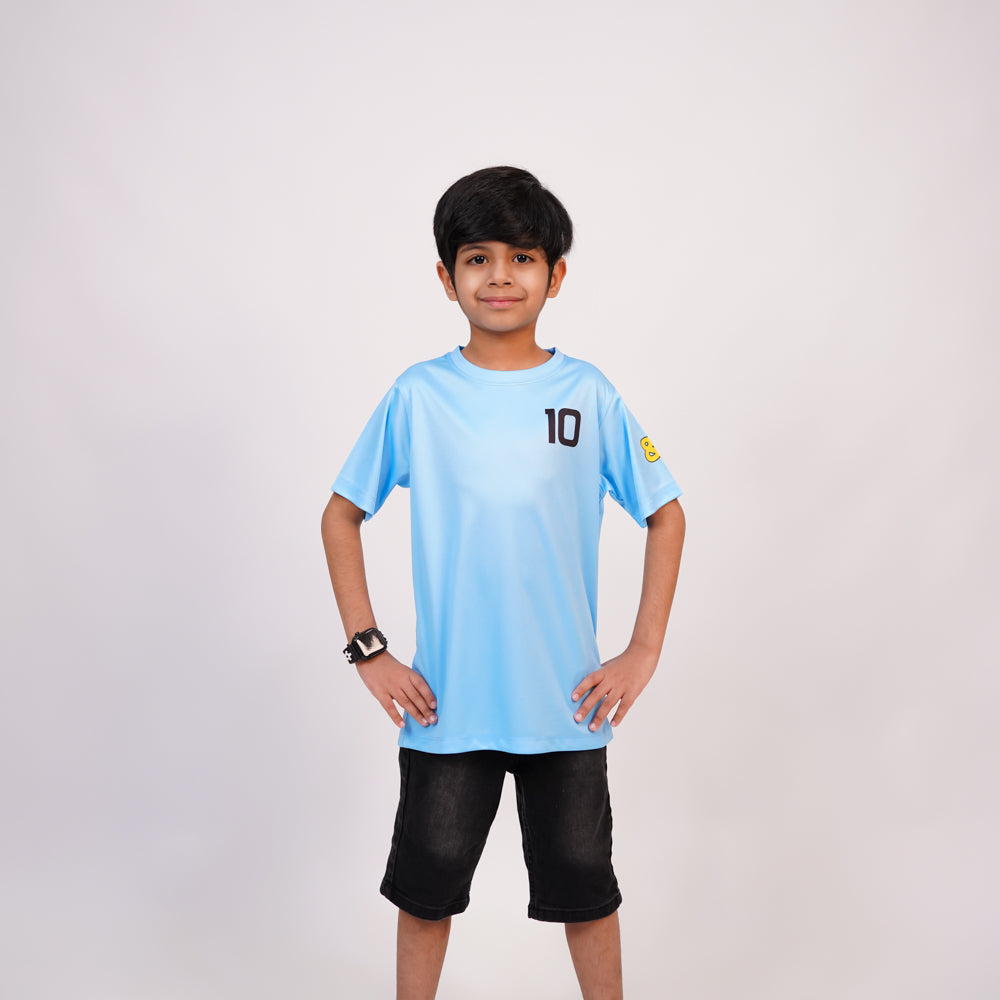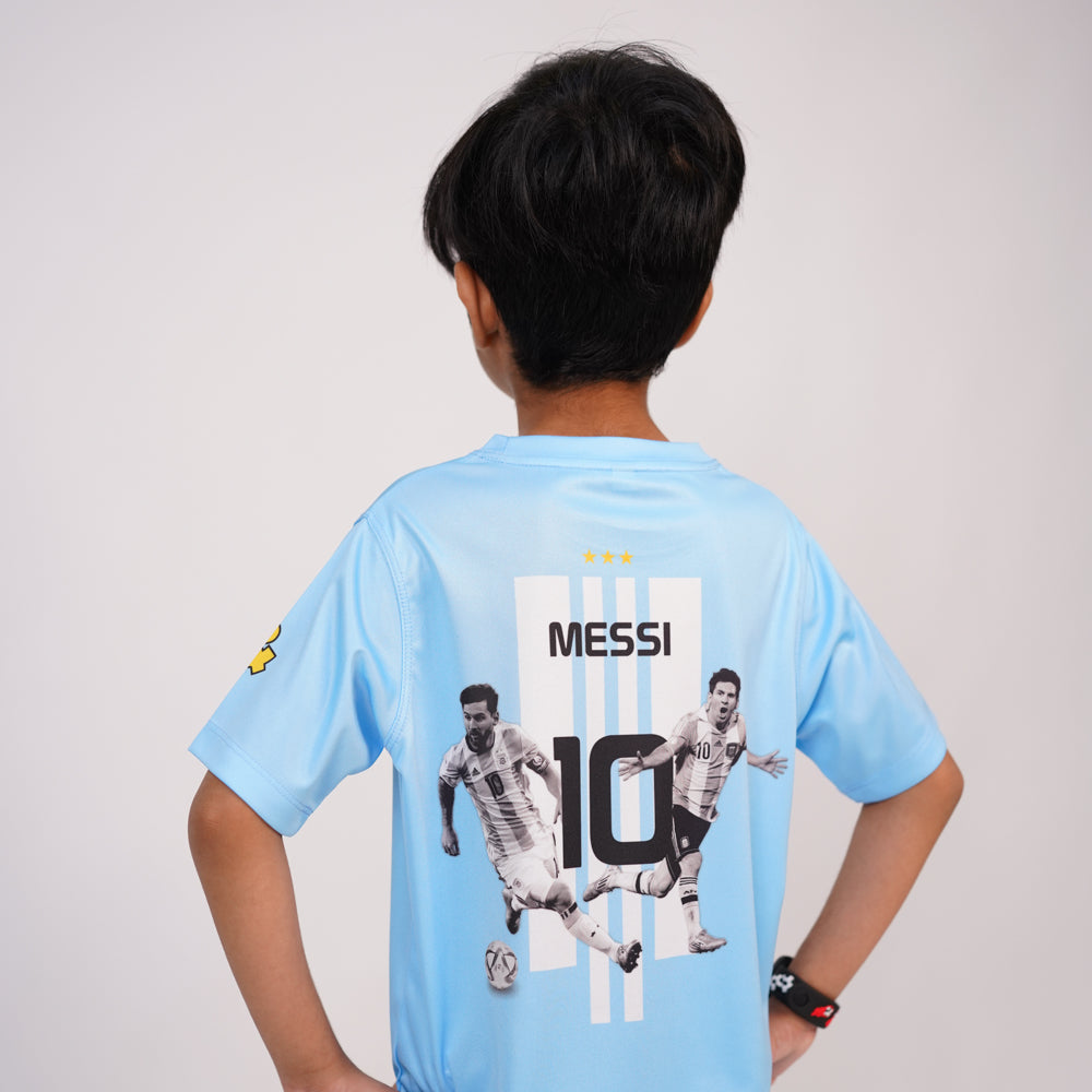 Let your child channel the energy and skill of Lionel Messi with this premium performance T-shirt. Designed for young athletes who aspire to play like the legend himself. Made from 100% polyester, it's soft, lightweight, and built for all-day comfort. Breathable and moisture-wicking to keep them cool during every game, practice, or play.