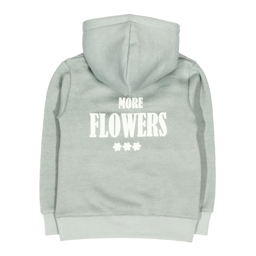 A cozy gray hoodie designed for children, featuring a charming 'MORE FLOWERS' design on both the front and back. Made from soft, comfortable fabric, it provides warmth and style for everyday wear. Complete with a practical hood, this hoodie is perfect for keeping little ones snug and fashionable during cooler days.