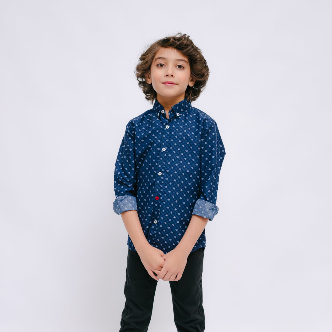 Presenting our blue button-up shirt with a classic collar. It features a dark blue base with a subtle light blue geometric print throughout. The slightly tapered sleeves with a regular fit give it a neat and chic look. It is made from premium cotton material making it a perfect choice for casual and semi-formal occasions in this hot weather. A sleek silhouette elevated by one unique button—because small details make a big statement.