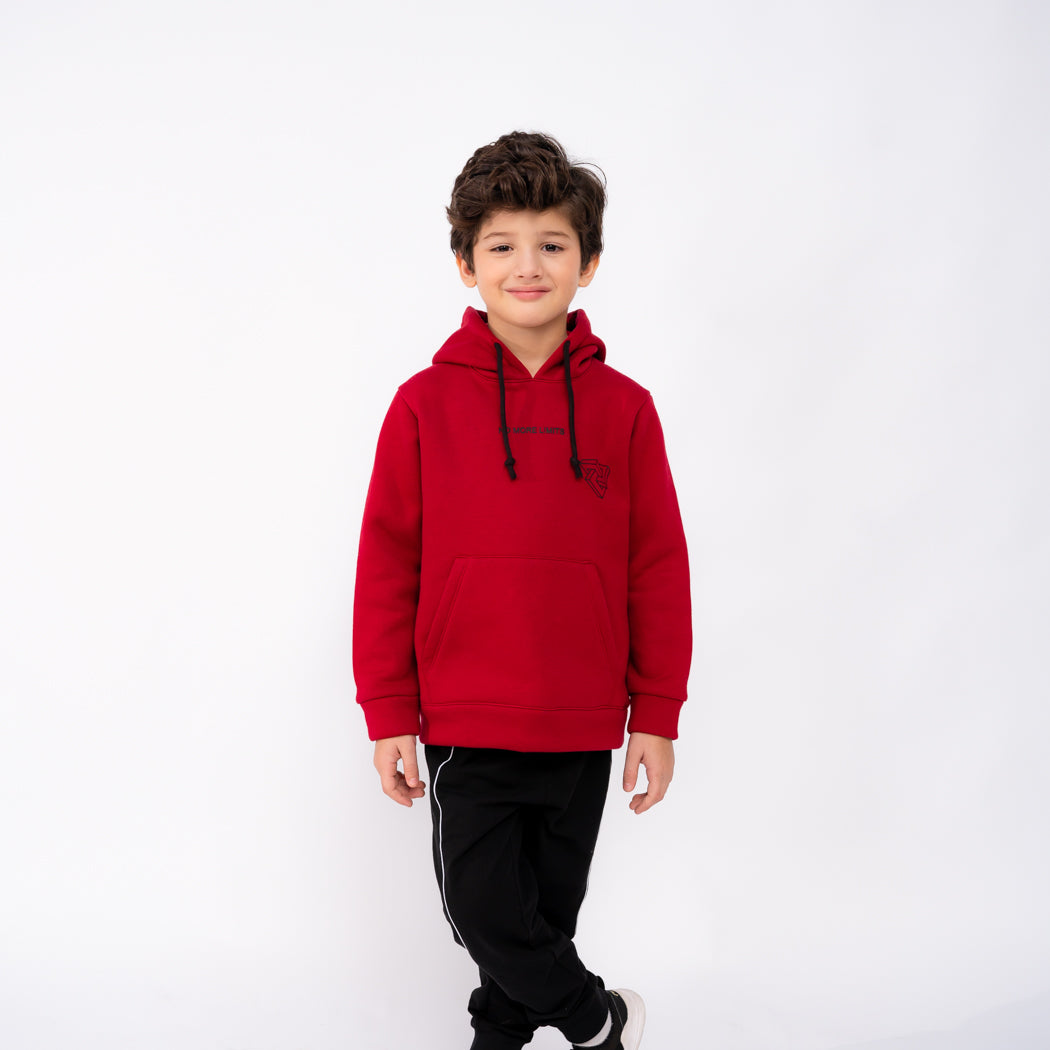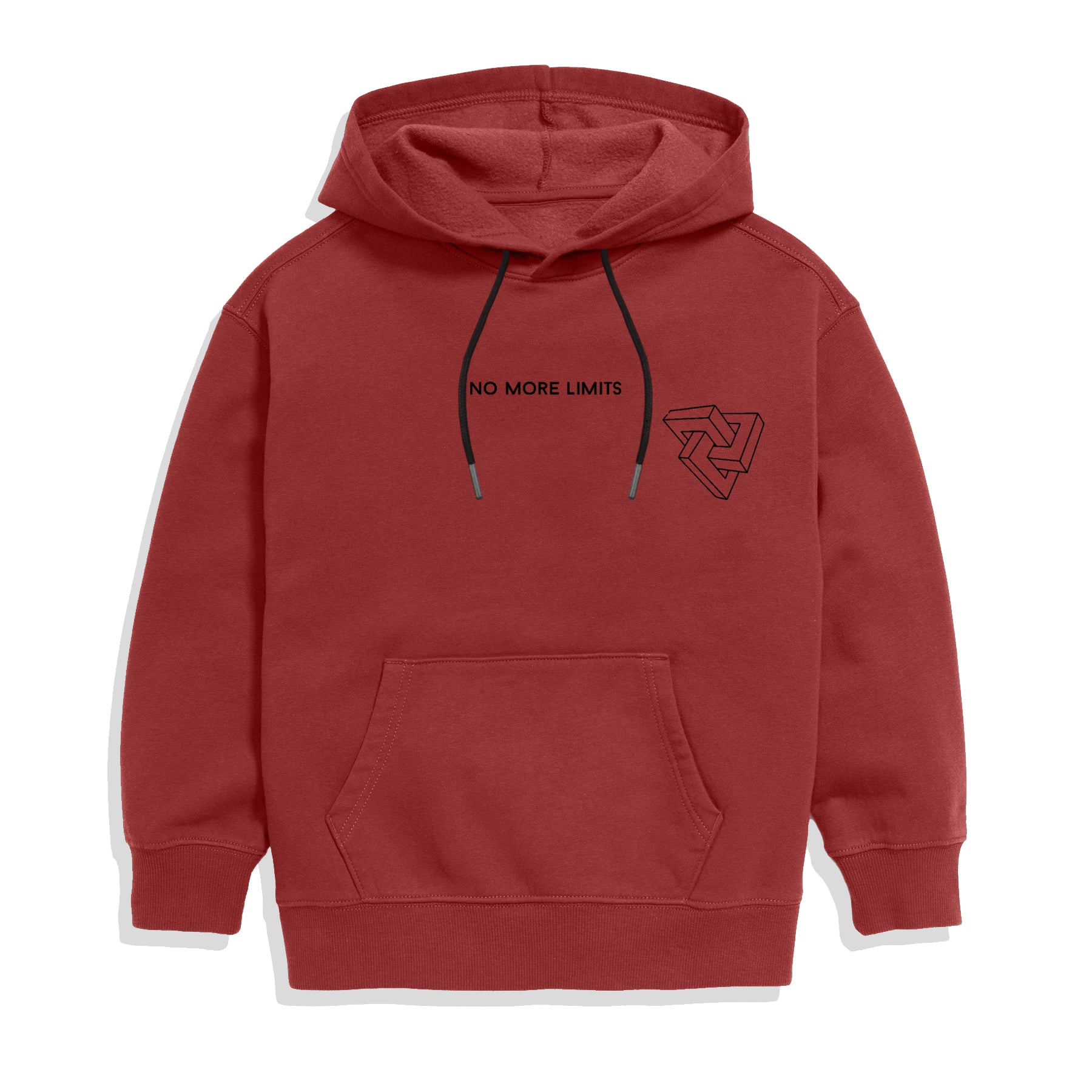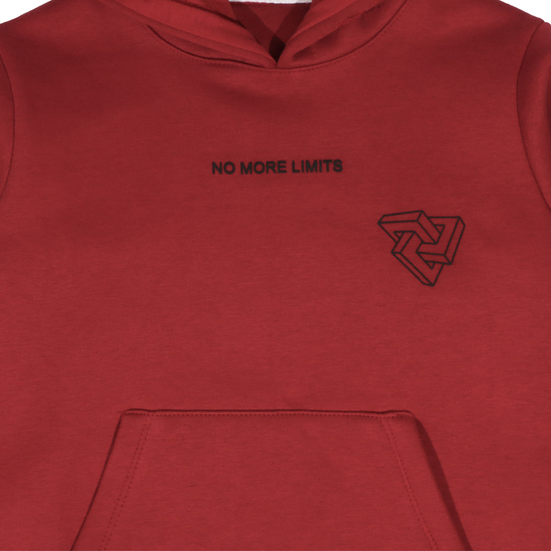 A cozy fleece hoodie in a rich maroon color, designed to keep kids warm and stylish through the winter season. Featuring a classic hood and front pocket, it combines comfort with practicality. The bold 'NO LIMITS' text on the chest adds a modern and empowering touch, making it a versatile piece that pairs easily with a variety of outfits.