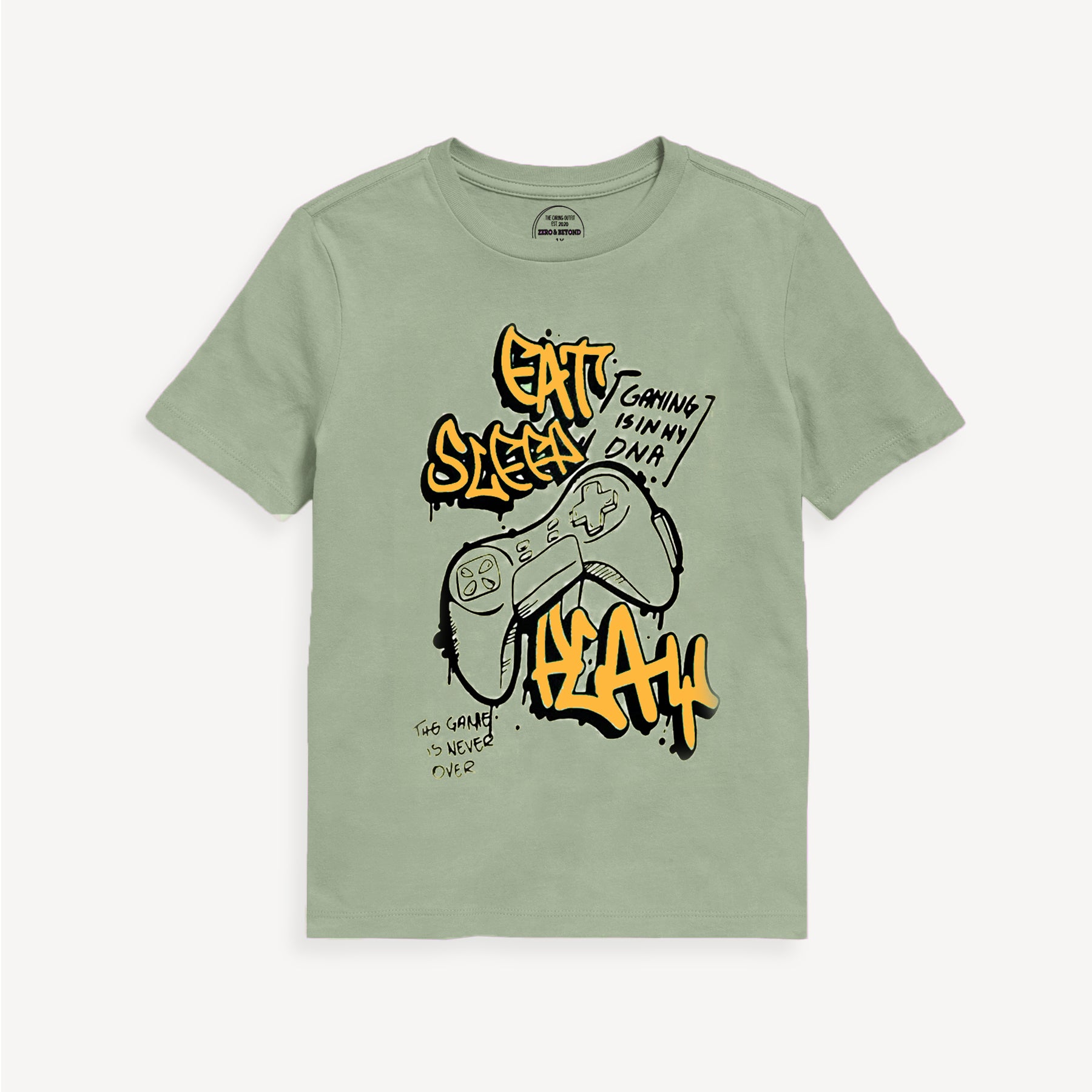 An olive green t-shirt designed with a fun gaming controller graphic and the bold yellow text EAT, SLEEP & PLAY. Crafted from soft, breathable fabric, it offers all-day comfort for active kids. A playful and trendy pick, perfect for young gamers to show off their style.