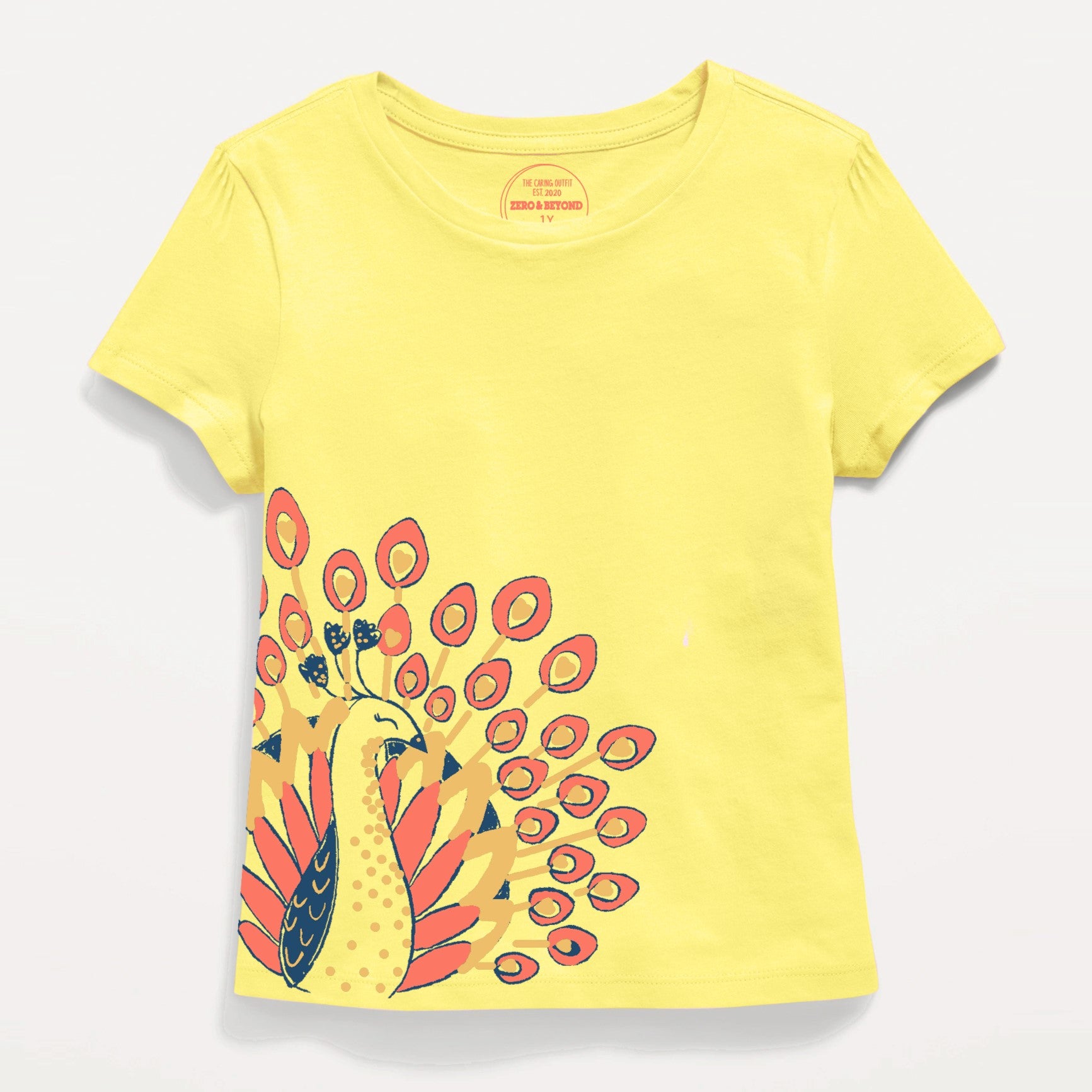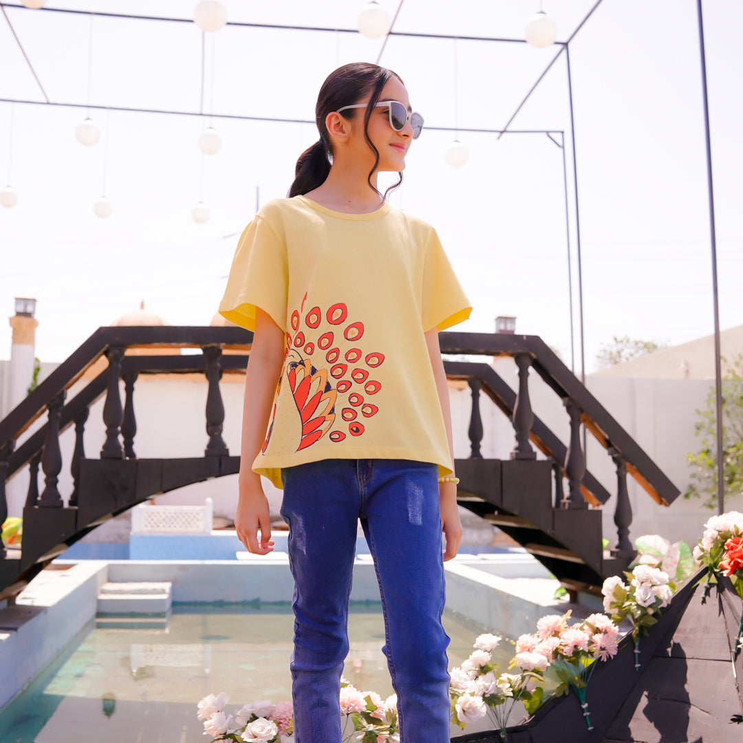 This t-shirt for girls features a beautiful peacock design. The bright yellow color with the orange and gold hues gives it a charming look. The soft cotton fabric feels comfortable on the delicate skin of your child so she can have endless fun all summer long.