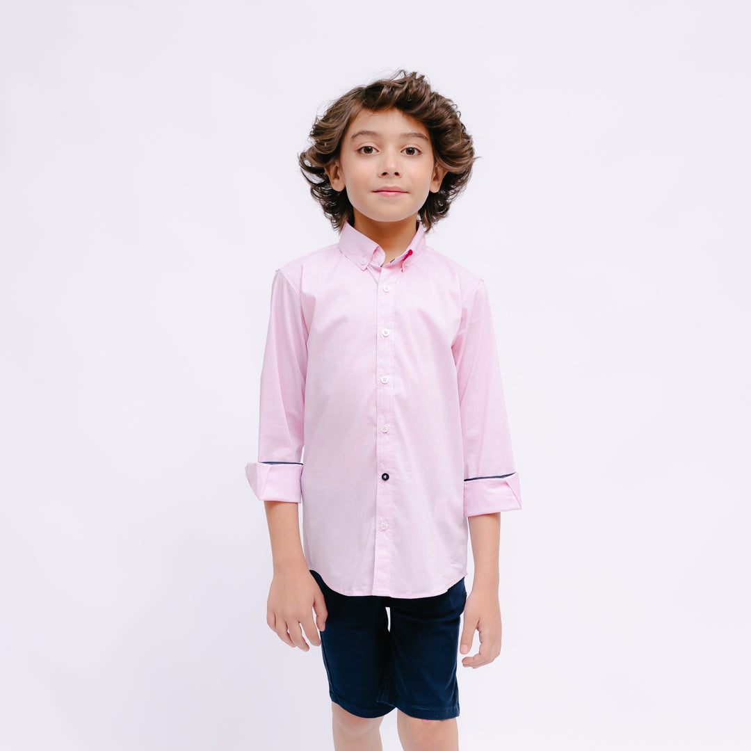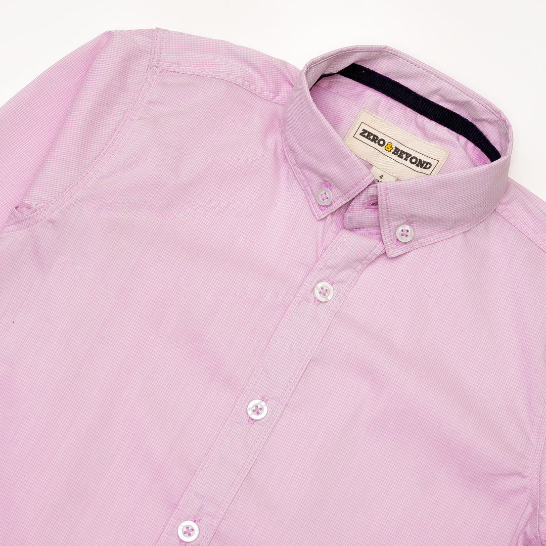 Brighten up your little man’s wardrobe with this stylish light pink button-up shirt. It features a cool micro-check pattern with a classic collar and long sleeves. The regular fit and breathable cotton material ensure all-day comfort. A sleek silhouette elevated by one unique button—because small details make a big statement. Pair it with shorts or denim and let your boy rock his summer style game!