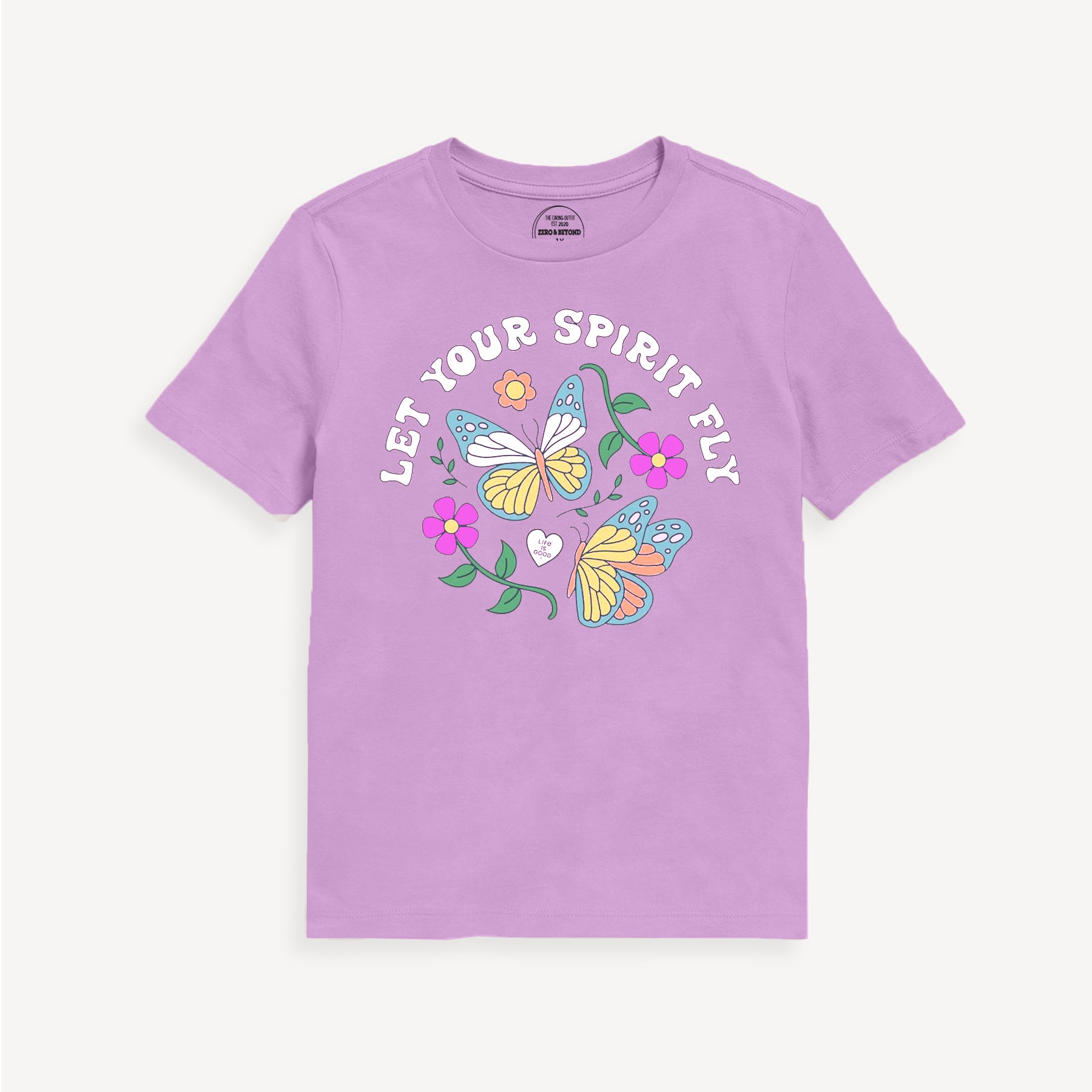 Let your little one shine in this uplifting purple tee. Features charming butterflies and flowers graphic with a “Let Your Spirit Fly” quote. Soft, breathable fabric ensures all-day comfort.