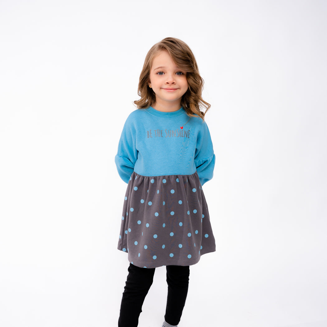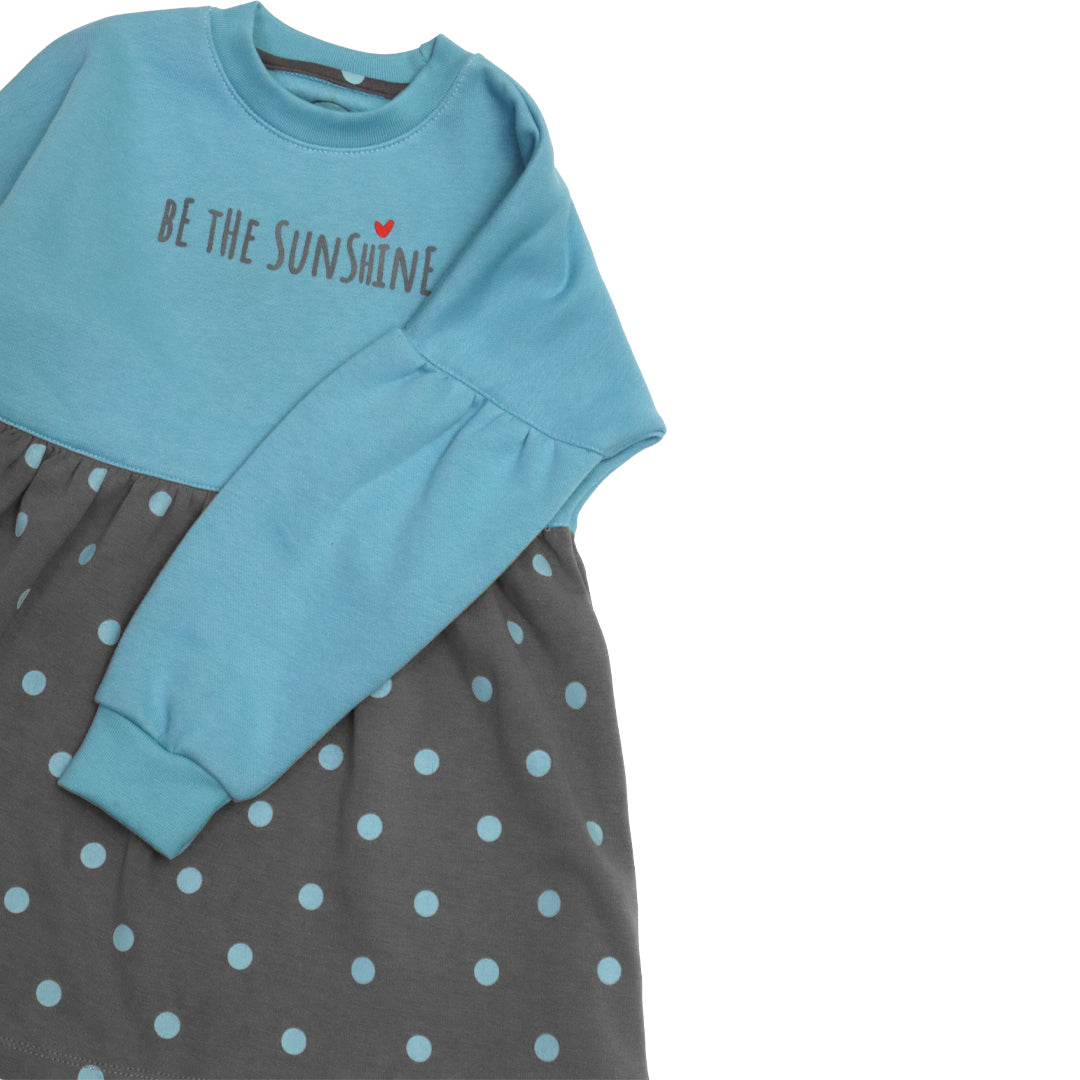 Keep your little one cozy and stylish this winter with this fleece skirted sweatshirt dress. The design features a blue upper half with the uplifting text "BE THE SUNSHINE" and a gray lower half adorned with playful blue polka dots. Crafted from soft fleece fabric, it offers warmth and comfort while adding a cute, cheerful touch. Perfect for chilly days, this dress blends practicality with a fun, fashionable look.