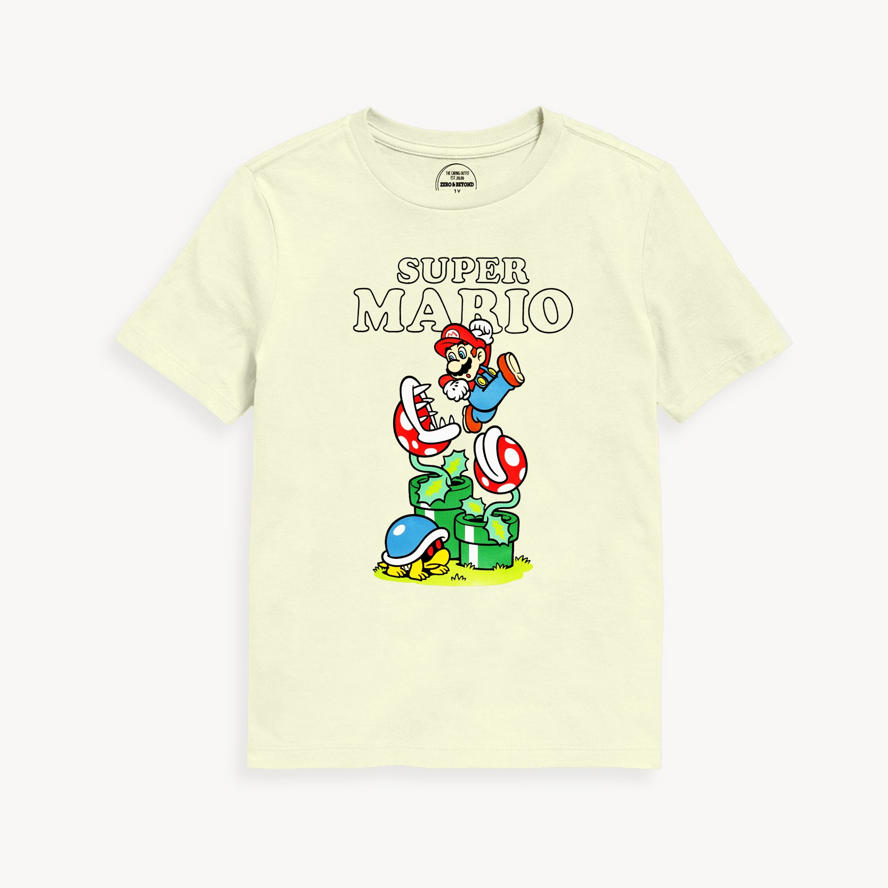 A light yellow t-shirt featuring a vibrant SUPER MARIO graphic on the front, perfect for little fans of the classic game. Made from soft, breathable fabric, it provides comfort and durability for everyday wear. Playful and colorful, it’s an ideal choice for school, playdates, or casual outings.