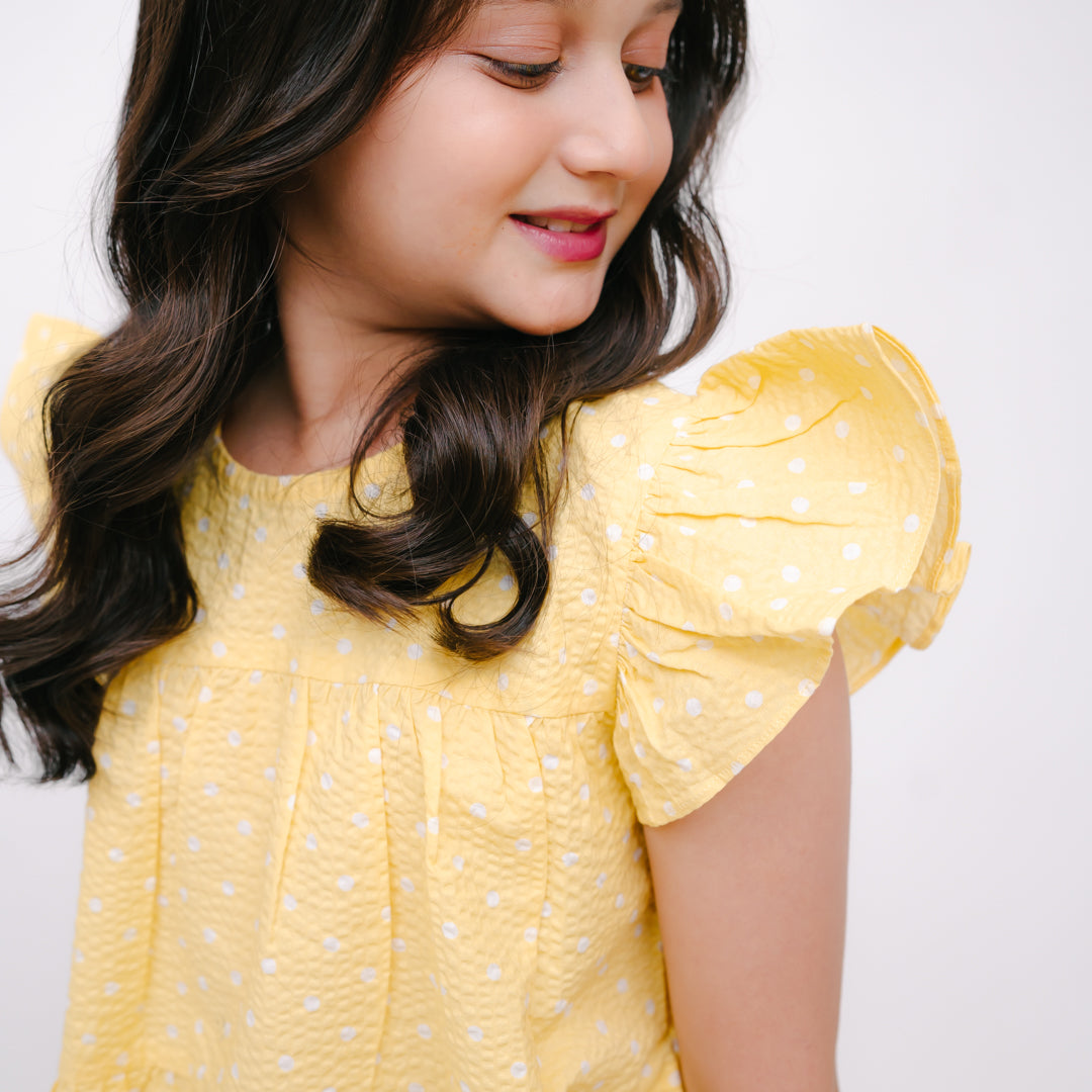 Add sunshine to your little girl’s wardrobe with our delightful yellow polka dot top. It has a round neckline with short ruffled sleeves, elevating the look of the whole outfit. The subtle texture and slight pleating add a lovely touch. This top is perfect for feeling cool and looking cute on warm sunny days.