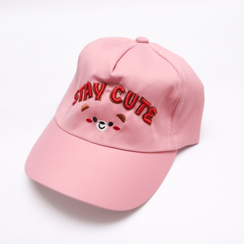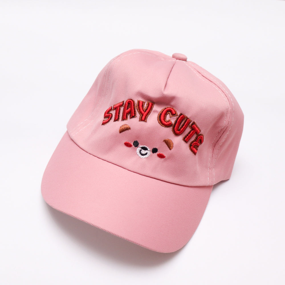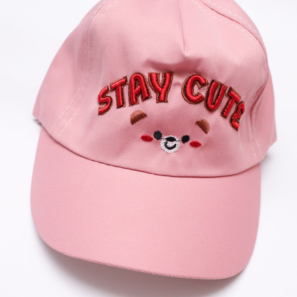 A stylish pink pee cap designed for girls. The front showcases a bold embroidered STAY CUTE and a smiley face logo, adding a cool touch. Its curved brim provides shade, making it perfect for outdoor wear. The adjustable strap ensures a snug and secure fit for growing kids.